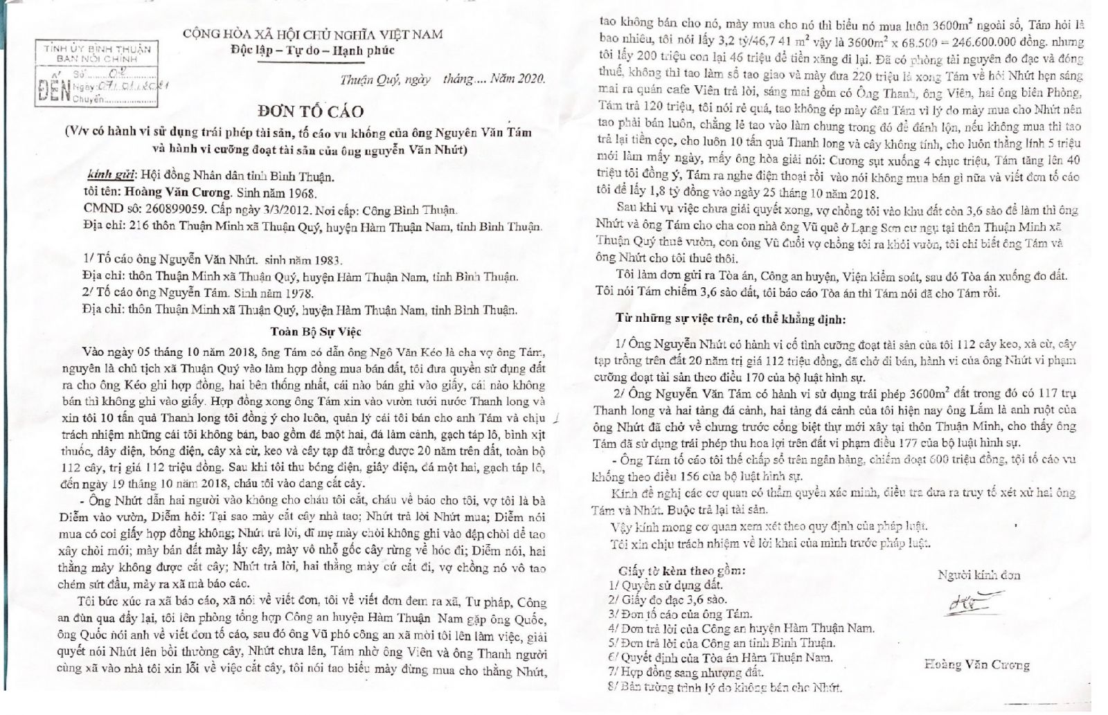 Ông Hoàng Văn Cương tố cáo ông Nguyễn Văn Nhứt, Nguyễn Văn Tám có hành vi vu khống, cưỡng đoạt tài sản của ông Cương để bán gồm 112 cây keo, xà cừ, cây trồng lâu năm, chiếm đoạt thửa đất 3600m2, 117 trụ thanh long, sử dụng trái phép gạch và đá cảnh trang trí trên thửa đất của ông Cương.