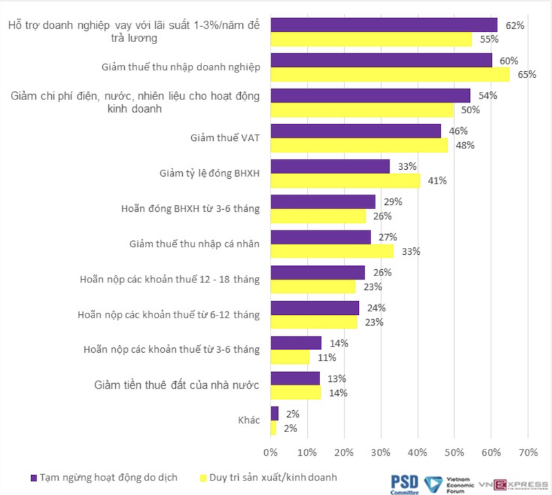 Ngoài ra, có gần 30% các doanh nghiệp cho là chính sách “hoãn đóng bảo hiểm xã hội từ 3-6 tháng” hoặc “giảm thuế thu nhập cá nhân” cũng là những chính sách hiệu quả.
