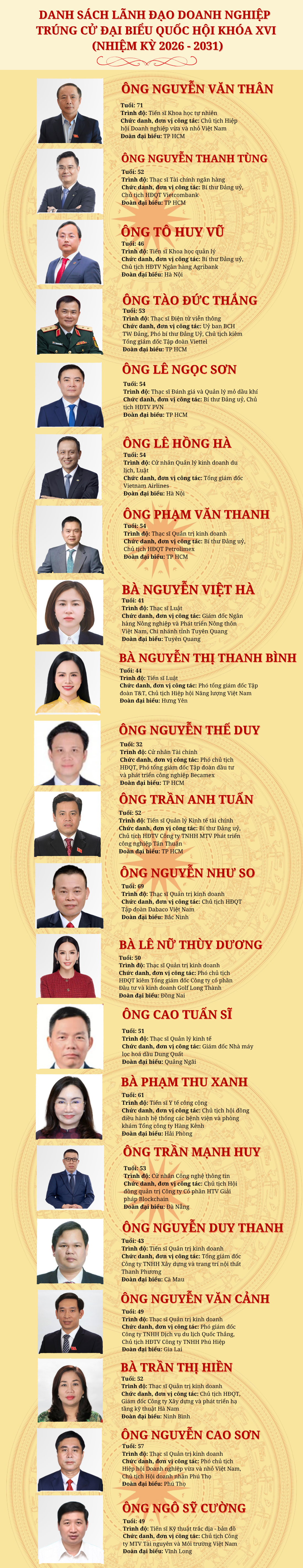 Trong danh sách 500 người trúng cử đại biểu Quốc hội khóa XVI, có sự góp mặt của nhiều lãnh đạo các tập đoàn, doanh nghiệp và hiệp hội lớn, được kỳ vọng sẽ mang tiếng nói thực tiễn vào nghị trường.