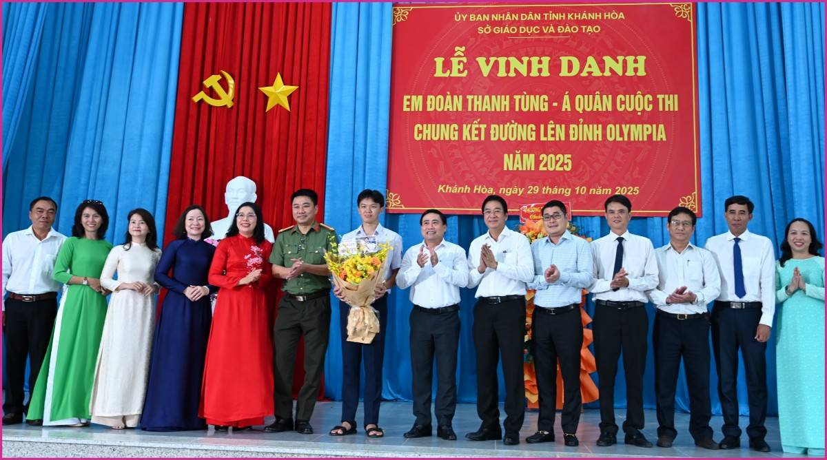Sáng 29/10, Trường Trung Học Phổ Thông Chuyên Lê Quý Đôn – Nam Nha Trang Khánh Hòa, long trọng tổ chức Lễ vinh danh, biểu dương và khen thưởng em Đoàn Thanh Tùng, học sinh lớp 12 chuyên Sinh – Á quân Cuộc thi Đường lên đỉnh Olympia năm thứ 25.Thanh Tùng là người đã mang cầu truyền hình Olympia về Khánh Hòa lần thứ hai, đồng thời xuất sắc giành ngôi Á quân năm 2025.