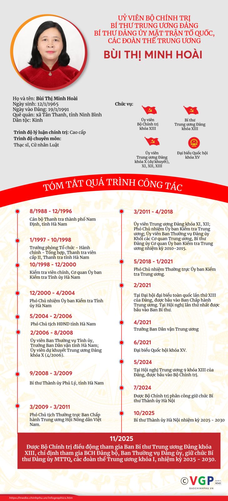 |   			 Đồng chí Bùi Thị Minh Hoài sinh ngày 12/1/1965. Ngày vào Đảng: 19/1/1991. Quê quán: tỉnh Hà Nam (nay là tỉnh Ninh Bình); dân tộc: Kinh. Trình độ lý luận chính trị: Cao cấp. Trình độ chuyên môn: Thạc sĩ, Cử nhân Luật Quá trình công tác của đồng chí: Tháng 8/1988 - tháng 2/1996: Đồng chí Bùi Thị Minh Hoài là cán bộ Thanh tra thành phố Nam Định. Tháng 1/1997 - 10/1998: đồng chí làm Trưởng phòng Tổ chức - Hành chính - Tổng hợp, Thanh tra viên cấp II, Thanh tra tỉnh Hà Nam. Tháng10/1998 - 12/2000: đồng chí là Kiểm tra viên chính, Cơ quan Ủy ban Kiểm tra Tỉnh ủy Hà Nam. Tháng12/2000 - 4/2004: đồng chí là Phó Chủ nhiệm Ủy ban Kiểm tra Tỉnh ủy Hà Nam. Tháng 5/2004 - 2/2006 là Phó Chủ tịch HĐND tỉnh Hà Nam; tháng 2/2006 - 8/2008 làm Ủy viên Ban Thường vụ Tỉnh ủy, Trưởng Ban Dân vận tỉnh Hà Nam; Ủy viên dự khuyết Trung ương Đảng khóa X (4/2006). Tháng 9/2008 - 3/2009: Đồng chí là Bí thư Thành ủy Phủ Lý, tỉnh Hà Nam. Tháng 3/2009 - 3/2011: Đồng chí làm Phó Chủ tịch Thường trực Ban Chấp hành Trung ương Hội Nông dân Việt Nam. Tháng 3/2011 - 4/2018: Đồng chí đảm nhiệm chức vụ Ủy viên Trung ương Đảng khóa XI, XII; Phó Chủ nhiệm Ủy ban Kiểm tra Trung ương; Ủy viên Ban Thường vụ Đảng ủy Khối các Cơ quan Trung ương, Bí thư Đảng ủy Cơ quan Ủy ban Kiểm tra Trung ương nhiệm kỳ 2010-2015. Tháng 5/2018 - 1/2021: Đồng chí giữ chức Phó Chủ nhiệm Thường trực Ủy ban Kiểm tra Trung ương. Tháng 2/2021: Tại Đại hội đại biểu toàn quốc lần thứ XIII của Đảng, đồng chí được bầu vào Ban Chấp hành Trung ương. Tại Hội nghị lần thứ nhất, đồng chí được bầu vào Ban Bí thư. Tháng 4/2021: Đồng chí đảm nhiệm chức vụ Trưởng Ban Dân vận Trung ương Tháng 6/2021: Đại biểu Quốc hội khóa XV. Tháng 5/2024: Tại Hội nghị Trung ương 9 khóa XIII của Đảng, đồng chí được bầu vào Bộ Chính trị. Đến tháng 7/2024: Đồng chí được Bộ Chính trị phân công giữ chức Bí thư Thành ủy Hà Nội. Ngày 3/11/2025, đồng chí được Bộ Chính trị điều động, phân công tham gia Ban Bí thư và chỉ định tham gia Ban Chấp hành, Ban Thường vụ, giữ chức Bí thư Đảng ủy Mặt trận Tổ quốc, các đoàn thể Trung ương./.  |