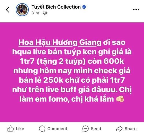 | Hoa hậu Hương Giang chia sẻ lại bài đăng từ fanpage Tuyết Bích Collection và phản hồi về thông tin thổi giá sản phẩm |