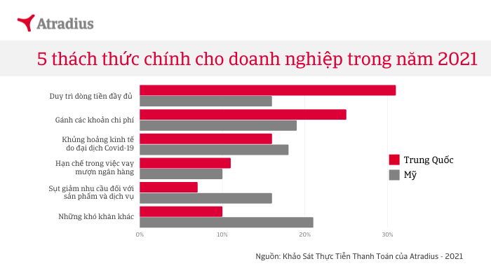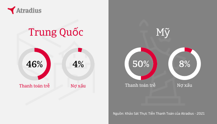 Ở Trung Quốc, kết quả khảo sát hành vi thanh toán của công ty vẽ ra một bức tranh rất khác. 4% hóa đơn B2B là phải xóa nợ vào năm ngoái và 46% bị thanh toán trễ. Mặc dù tỷ lệ nợ xấu ở Trung Quốc bằng một nửa tỉ lệ được báo cáo ở Mỹ, nhưng nó đã tăng 33% so với khảo sát mà Atradius thực hiện vào năm 2019, trước khi đại dịch toàn cầu ập đến. Để bảo vệ dòng tiền của chính họ, các doanh nghiệp tại Việt Nam cần theo dõi liên tục mức độ tín nhiệm của mỗi khách hàng riêng lẻ bên cạnh việc ghi nhận xu hướng trong thực tiễn thanh toán của từng thị trường.