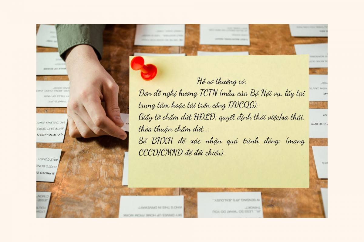 Sáng hôm sau, chị Lan đến trung tâm việc làm gần nhà trọ. Bảo vệ chỉ tay: Cần đơn đề nghị, quyết định thôi việc, sổ BHXH. Có thể nộp trực tiếp, gửi bưu điện, hoặc ủy quyền nếu cần.