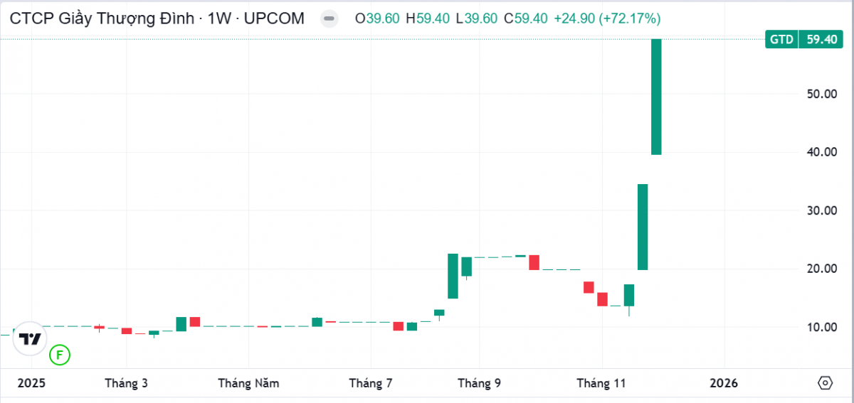 Cổ phiếu GTD của Giầy Thượng Đình đang là một trong những hiện tượng "hot" trên cả 3 sàn chứng khoán khi tăng hết biên độ liên tiếp từ ngày 19/11 đến nay. Sau quãng thời gian dài quanh mốc 13.500 đồng/cp, cổ phiếu này đã vọt lên tới 59.400 đồng/cp chốt phiên 4/12, tức là tăng 340% chỉ sau 12 phiên giao dịch. Với mức giá này, Giầy Thượng Đình đang được định giá khoảng trên 550 tỷ đồng, là mức định giá cao nhất mà công ty có được kể từ khi đưa cổ phiếu lên giao dịch trên thị trường chứng khoán.