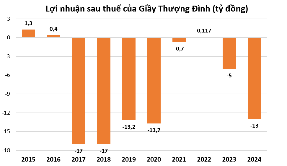 Bước sang năm 2024, tình hình tiếp tục khó khăn khi doanh thu công ty giảm gần 2% còn 78,8 tỷ đồng, trong khi giá vốn và chi phí tăng khiến Giày Thượng Đình lỗ sau thuế gần 13 tỷ đồng.