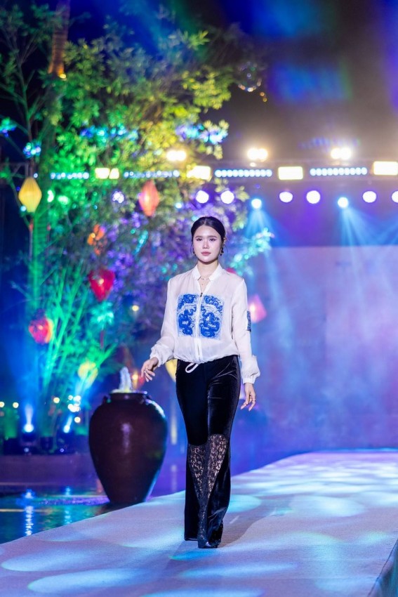 Bằng chất liệu lụa mỏng nhẹ như làn sương, những tác phẩm tại đây được “điêu khắc” bằng hai kỹ thuật in độc đáo: cyanotype và in muối – tái hiện các hoa văn tứ linh, tứ quý từ lăng miếu, đền đài xưa cũ. Mỗi hình ảnh hiện lên như lời thì thầm của quá khứ, gợi nhắc về những di sản văn hóa từng rực rỡ trong dòng chảy của thời gian.