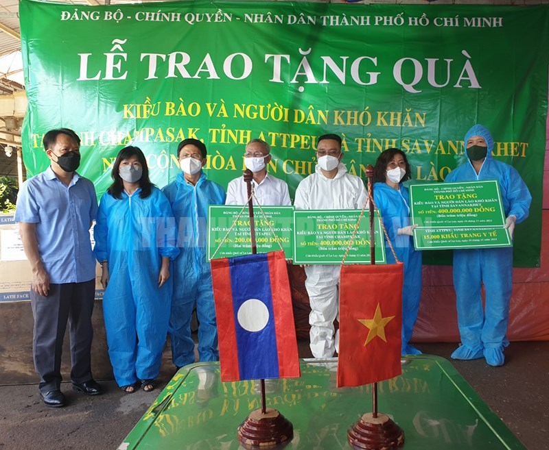 Do dịch Covid diễn biến phức tạp, để đảm bảo các quy định, điều kiện phòng chống dịch bệnh tại Việt Nam, Ủy ban về người Việt Nam ở nước ngoài TPHCM tổ chức trao tặng số quà trên thông qua Hội người Việt Nam tại tỉnh Savannakhet (Lào), Hội người Việt Nam tại tỉnh Champasak (Lào), Hội người Việt Nam tại tỉnh Attapeu (Lào), tiếp nhận các phần quà này, cùng phối hợp với chính quyền địa phương rà soát, lập danh sách kiều bào, người dân Lào khó khăn đang sinh sống tại địa phương và thực hiện công tác trao tặng tận tay kiều bào và người dân khó khăn.