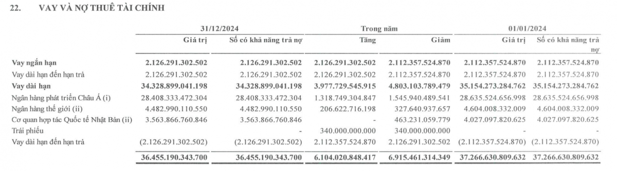 Cũng như nhiều doanh nghiệp thực hiện các dự án đầu tư công trình lớn khác, VEC cũng sử dụng đòn bẩy. Tại cuối năm 2024, tổng nợ phải trả hơn 50.227 tỷ đồng, trong đó có tới gần 36.500 tỷ là đi vay, hầu hết là khoản vay dài hạn. Các khoản vay dài hạn của VEC là đồng USD, đến từ các tổ chức quốc tế như Ngân hàng Phát triển châu Á (ADB), World Bank và Cơ quan hợp tác quốc tế Nhật Bản với thời hạn vay lên tới hơn 30 năm.